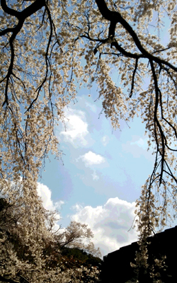 JR線路沿いの桜並木は五分咲きながら、地元の方に教えてもらった子安地蔵尊の垂れ桜は、満開真っ盛り。枝の中に入ると、頭から足まで全身を、自然のままに垂れる桜に包まれ、何とも幸せ気分を味わう。