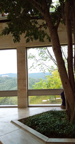 石山からバスで、渓谷を抜け50分ゆられ着いた先は、山の頂上二つを大きな橋でつないだ、ルーブル美術館のガラスのピラミッドの建築家の作品だけあって、日本のテイストを活かしつつ、とてもスケールの大きな空間のミュージアム。