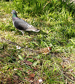 レッスンの合間に公園に行き、お団子を片手に、桜の根元に腰掛けてのんびり、ふと後ろに気配を感じ振り返ってみたら、肩先すぐに雀さんがいて、目が合って 互いにびっくり。