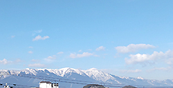 ボタンを押してホームに降りたら、比良山系の山々が白く神々しくそびえ立っていた。