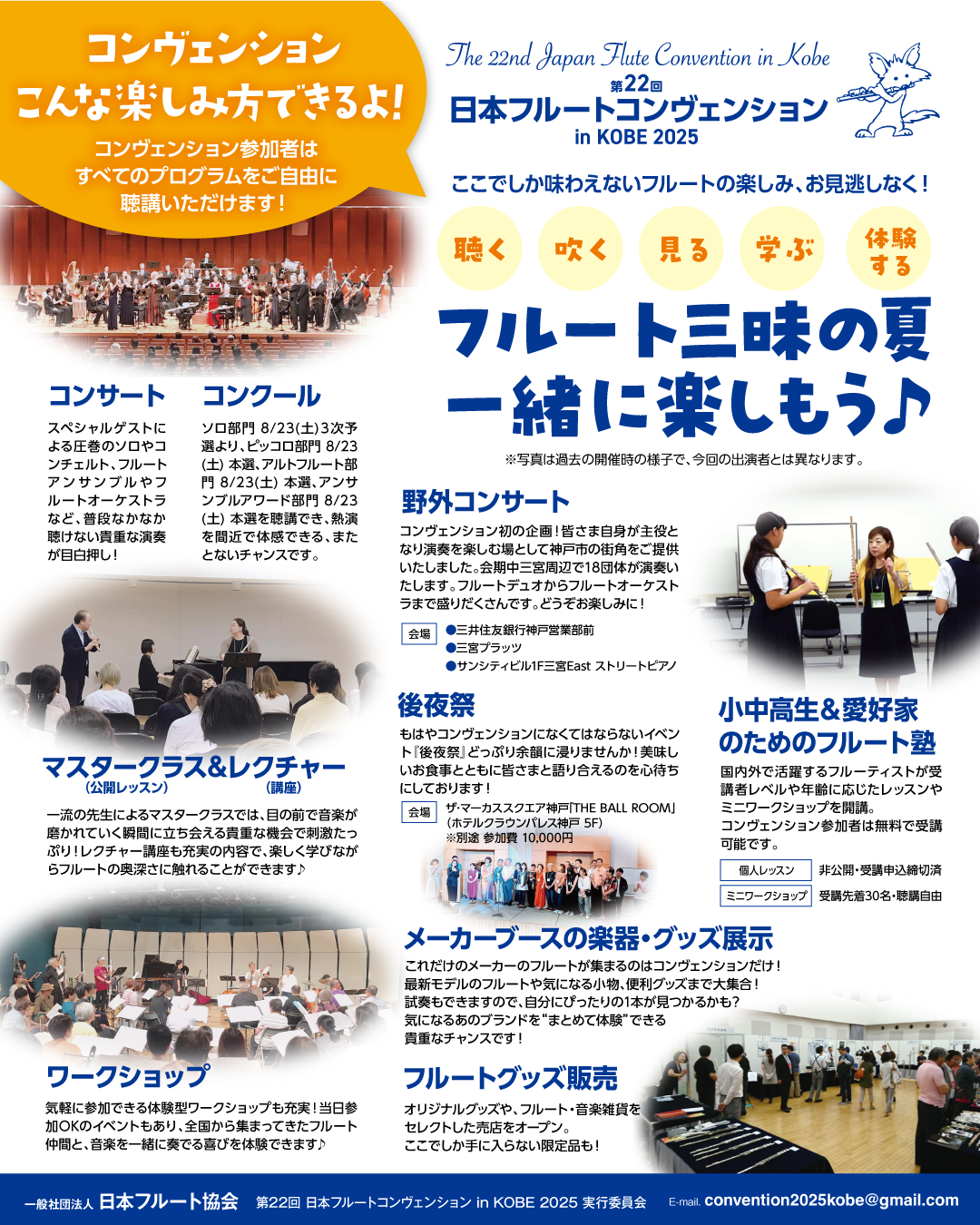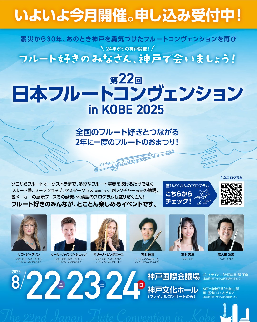 そして、フルートのお祭り、フルートコンベンションが神戸で8月22日、23日、24日に催され、先日NHK交響楽団の演奏会放送で、イベールの協奏曲を見事に吹かれたシュッツさんも、ピッコロの名手などがゲストに、リサイタルやフルートオーケストラ、公開レッスン、コンクールも聴けて、そして色々なメーカーの楽器の吹き比べも出来るイベント。