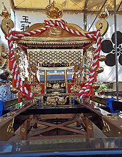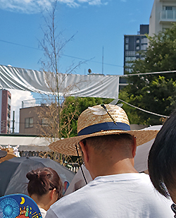 待って45分、担ぎ手の方々が集まり、関係者の袴姿が増え、いよいよかしらと思ったら、この前はお神輿さん通りませんよと…。